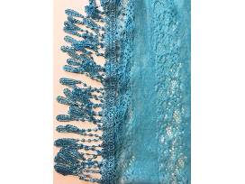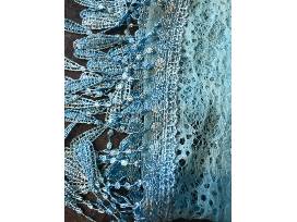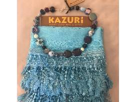This beautiful necklace has shades of blues and purples. It is accompanied by a fashionable aqua blue fringed infinity scarf.