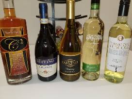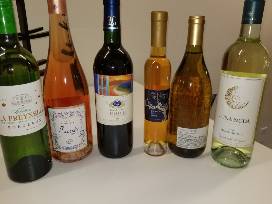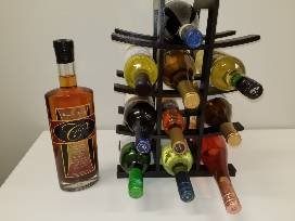 11 bottles of assorted wines, with black wine rack.