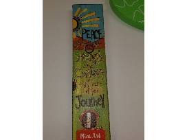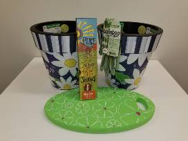 Includes 2 Art Pots featuring daisies; small garden gloves, decorative yard stakes, & kneeling pad. Flower pots are shades of blue & white.