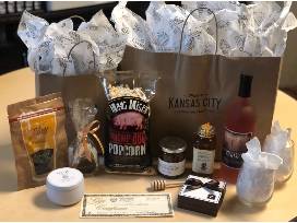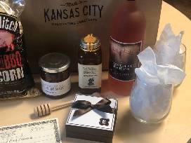 Take a moment and appreciate all things Kansas City with this basket of items from local vendors! Basket includes: Stonehaus Farms Vineyard & Winery gift card ($50); bottle of wine; two stemless wineglasses featuring the Country Club Plaza; Messner Bee Farm honey; BBQ popcorn; Christopher Elbow chocolates; Caramels; beef jerky; Isinmi Candle Company candle.