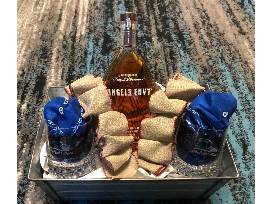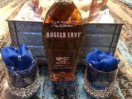 Sip on a glass of Angels Envy Kentucky Straight Bourbon Whiskey in a set of Sheffield Place whiskey glasses. Angels Envy is 750 ML and 86.6 proof. Rustic tin basket included.