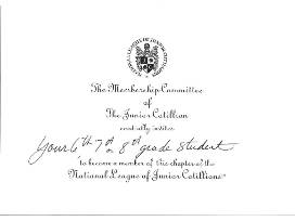 The purpose of the National League of Junior Cotillions is to offer young people instruction and practice in the courtesies that make life more pleasant for them and those around them, to offer thorough training in standard ballroom dance and to provide opportunities to practice and enjoy the skills at memorable parties, dances/classes and balls complete with decorations, refreshments, favors and prizes. Students receive an invitation in the spring to join and then begin classes in the fall. There are 7 events, occurring monthly from August through March, skipping December.
