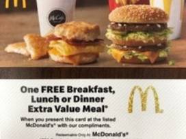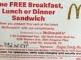 Gift Card Package includes:2 Free Hamburger or Cheesburger, 2 Free Soft Drinks or McCafe Beverage, 1 Free Value Meal, 1 Free Breakfast, Lunch or Dinner Sandwich