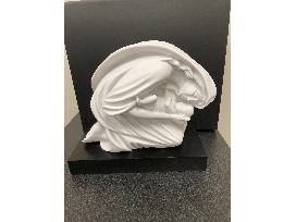 Mary envelopes the child Jesus in motherly love cradling Him in her arms with her cheek gently pressed to His face as He plays with her hair. This solid resin-stone cast is left in its natural Carrara white color and is mounted on a solid matt black base. Timothy personally sculpts every original small masterpiece complete with his signature or monogram. Each replica is detailed by hand to the exacting standards of this modern day master sculptor.