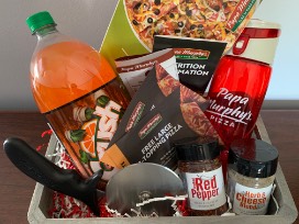 Pizza Night Basket - basket with free pizza, 2 liter soda, pizza slicer, spice shakers, plastic cups