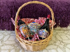 Gift Certificate for Dinner for Two at BBC Tavern in a Basket with an Antique Chocolate Tin & Two bottles of Michael David Red Wine
