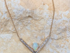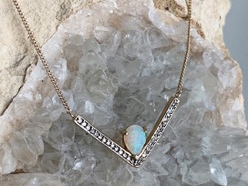 Hand made 14k yellow gold chain necklace set with a 7x5mm custom rose cut pear-shaped Australian Opal, with White Diamond pavé set into gold v-shaped pendant. Necklace measures 17 inches long.
