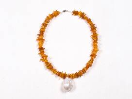 Kitano Necklace: Handmade in New York of golden Baltic amber, real cultured fireball pearl and sterling silver hardware. 15.5" in length.