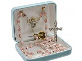 The rosary for her features 6x9mm pink oval stripe painted Italian wood beads with 8mm Our Father beads. Sterling silver Miraculous Medal center and 1 3/4" sterling silver Crucifix with rhodium plated brass findings to prevent tarnishing.