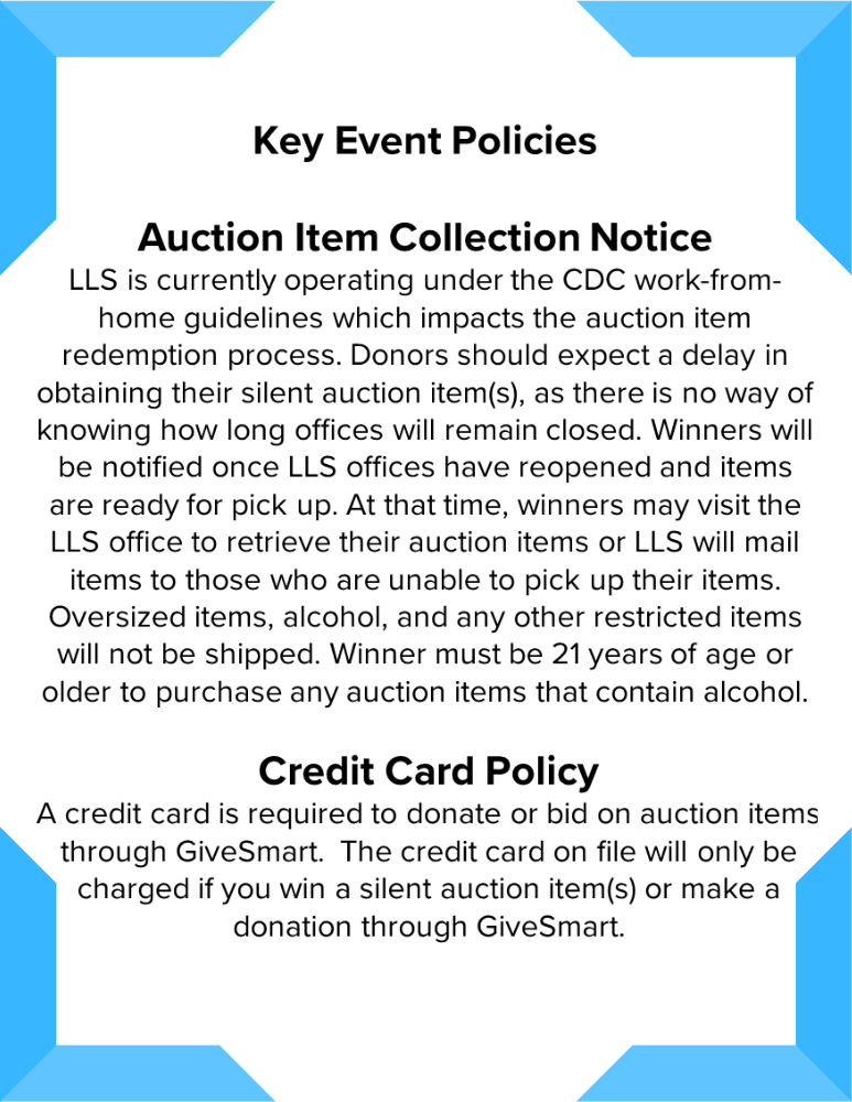 Auction winners are required to make payment the night of the event. Please note that you will have the choice to either pay credit card charges immediately or we will run all remaining balances on all cards on file at midnight.