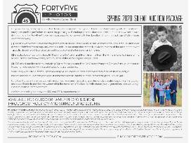 (1) one free weekend* outdoor family photo session at one of the many scenic locations throughout the Houston area at which FortyFive Photos regularly meets clients (to be completed within six to seven months of the date of the event - specific deadline will be stated on certificate provided after donation is finalized); (2) a collection of four prints (one 8x10 print; one 5x7 print; and two 4x6 prints) from the winner's favorite image of the session (all four auction-winning prints must be of the same original image); and (3) 20% off all additional items, including Digital Packages and Fine Art Gallery Wrapped Canvas Prints, purchased at the same time auction-winning print selections are redeemed. * One long weekend a month, approximately will be available for auction winners to redeem their packages.