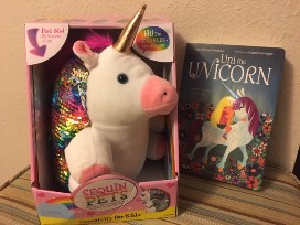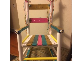 Don't miss out on this adorable rocking chair which was hand painted in glitter paint (of course) by a local artist. This set also comes with a super soft unicorn pillow, a unicorn stuffed animal and book. This is sure to dazzle any unicorn lover.