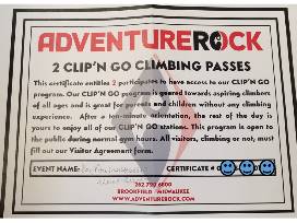 Adventure Rock CLIP'N GO gift certificate for two (2) locations in Brookfield and Milwaukee. Most of Adventure Rock's first-time users participate in the Clip'N Go program. This means no pesky knots to tie, no commands to learn, heck, you don't even need a partner! After one of their friendly staff takes you on an orientation, explaining how to utilize our facility properly, you will simply clip into one of the many Clip'N Go stations and begin climbing - it's that easy! The Clip'N Go passes last the entire day, so if those forearms need a break, feel free to leave and come back within the same business day.