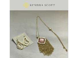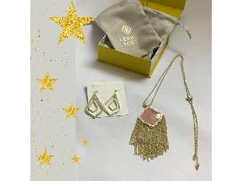 In your new Kendra Scott set! Set includes Kingston Necklace in gold with Rose Quartz and Simon Earrings in Gold.