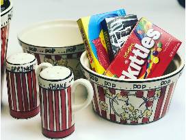 - Ceramic Popcorn Bowl Set with large bowl, 4 small bowls and 2 shakers