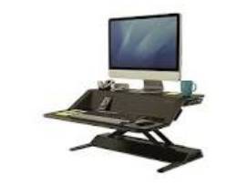 Fellowes White Lotus sit-stand converts your existing desk into a sit stand workstation. Smooth lift technology keeps your workstation stable and makes changing positions effortless. Cord management with device charging slot allows keyboard and mouse to move freely. Comes fully assembled.