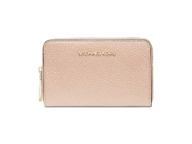 Polished lettering distinguishes a Michael Michael Kors leather zip-around case that organizes cash and cards.