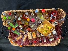 A "mini" something for everyone! Fireball, Captain Morgan, Smirnoff, Jack Daniel's-are just a few of the brand name bottles included. This basket would be a great way to stock your home bar or have on hand for an upcoming party. Add wrap and a bow and be the talk of the town when you walk into a party with this!