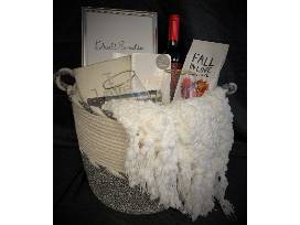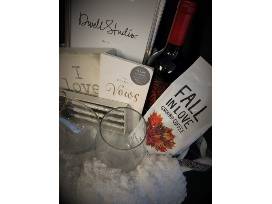 Perfect for spending quality time with a loved one, or gifting to a newly engaged couple, this basket was packed with love by Taylor Phipps from the Remax One Fidelis Group. Unpack this grey and white woven basket and you'll find a sleek silver 8x10 inch picture frame, soft white throw blanket with fringe, decorative wooden "I Love Us" sign, Pumpkin Spice ground coffee, Apothic Red Blend wine, and gold rimmed stemless wine glasses. Sip on some wine and break out the Rae Dunn set of ballpoint pens and Wedding Vows journal to jot down your thoughts, promises, and dreams for your loved one.