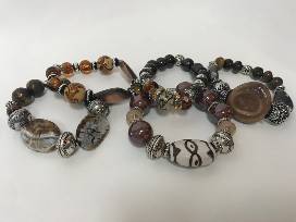 Local artist Marilyn Gonrowski is an impressionist artist who also does 3 D abstract painting. Her jewelry is made from semi-precious stones, coral, quartz, agates, Druzy geodes. You'll love this neutral set of 5 bracelets in copper, brown, and agate tones.