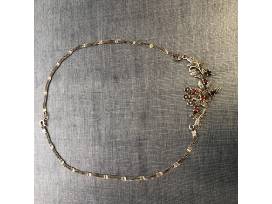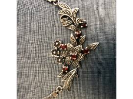 Antique style pre-owned sterling silver 17" necklace featuring a floral design motif accented with red stones on a three-strand sectioned chain. Estimated value $150