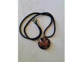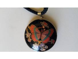 Beautiful Cloisonne Butterfly necklace. The butterfly is the same on both sides. The black cord is 14 1/2" long and the butterfly is 1 1/4" high. Drawstring bag included.