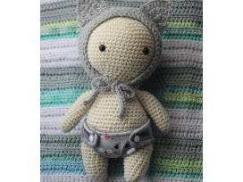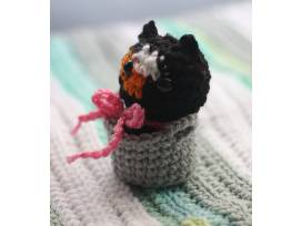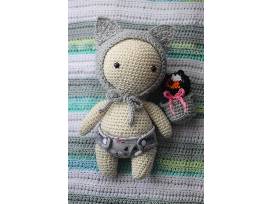 Adorable hand-made 12 inch crochet baby doll with grey kitty bonnet, matching cloth diaper, and little calico kitty friend in basket.