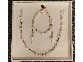 Beautiful in box Magnolia brand jewelry set. Matching necklace, bracelet and earrings, too! Round pearls, seed pearls, gold and silver beads - really beautiful set. .925 sterling silver with cultured pearls.