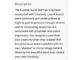 The humble laurel leaf has long been associated with Creativity. Laurel leaves were commonly put under pillows at night to gain inspiration through dreams and its intoxicating properties are associated with prophetic and poetic inspiration. Our designers used their own creativity when they created this beautiful laurel leave complete with it's own "shadow" or mirror image behind. Wearing this beautiful piece may inspire your own creativity.