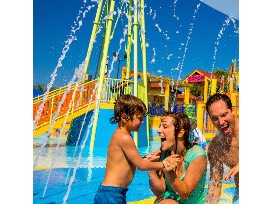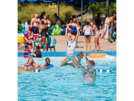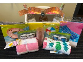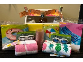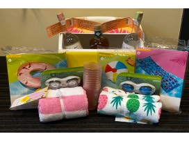 - An assortment of summertime essentials including two (2) pairs of Speedo goggles, two (2) beach towels, cups, a tube, pool float, and beach ball