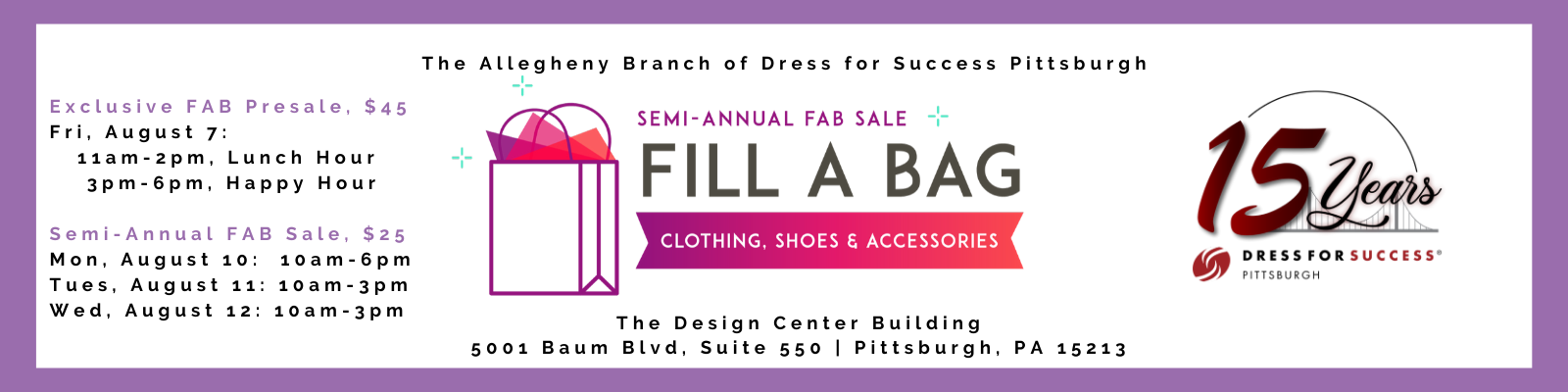 All FAB bags can be purchased online via credit/debit card, directly by cash or personal check made payable to Dress for Success Pittsburgh. Cashless payment methods are strongly encouraged.