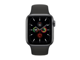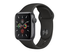 Apple Watch Series Five Space Gray Aluminum Case with Black Sports Band.