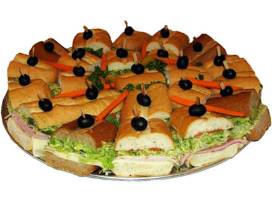 Great for office or home parties, partly because there's very little notice. Twenty four 3" pieces of top 5 sellers like turkey and provolone, the Big Dude Italian combo, lean roast beef and cheese, a club sub and some vegetarian, like avocado and cheese with marinated cucumbers, on wheat. All laid out on a decorative platter with toothpicks and olives ready to eat. Feeds approximately 15