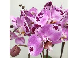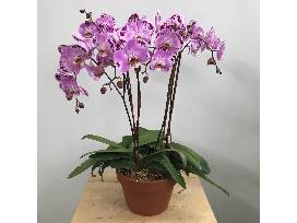A terra cotta pot with a grouping of Phalaenopsis Long Pride 'Happy Dancer', a new pink hybrid with delicate maroon spotting in bloom. Some of the latest breeding in one of the most popular and easy to grow orchids for the home. Phalaenopsis are long lasting, colorful, and one of the easiest orchids to rebloom. Absolutely perfect for a gift to a friend or even yourself, they are stunning arrangements to enjoy for many weeks of color.