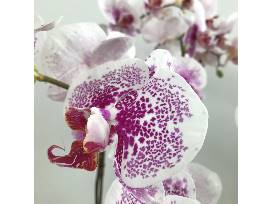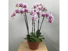 A terra cotta pot with a grouping of the striking white and heavily spotted Phalaenopsis Monet's Spots in bloom. Some of the latest breeding in one of the most popular and easy-to-grow orchids for the home. Phalaenopsis are long lasting, colorful, and one of the easiest orchids to rebloom. Absolutely perfect for a gift to a friend or even yourself, they are stunning arrangements to enjoy for many weeks of color.
