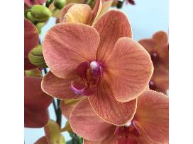 A terra cotta pot with a grouping of the unusual mango-orange colored Phalaenopsis Surf Song in bloom. Some of the latest breeding in one of the most popular and easy-to-grow orchids for the home. Phalaenopsis are long lasting, colorful, and one of the easiest orchids to rebloom. Absolutely perfect for a gift to a friend or even yourself, they are stunning arrangements to enjoy for many weeks of color.