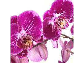 A terra cotta pot with a grouping of Phalaenopsis Ox Spot Queen, a new pink harlequin hybrid in bloom. Some of the latest breeding in one of the most popular and easy-to-grow orchids for the home. Phalaenopsis are long lasting, colorful, and one of the easiest orchids to rebloom. Absolutely perfect for a gift to a friend or even yourself, they are stunning arrangements to enjoy for many weeks of color.