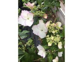 This hydrangea is known for its extraordinary double, serrated white sepals, tinted the palest shade of pink with an increasingly deep coloration of green as the flowers mature, while the center of small fertile flowerheads maintain a delicate pastel pink hue. The fuzzy, felt-texture foliage is soft blue-green, making a striking combination with the pink blush and clean white flowers that gradually become more green over time. Blooms late summer into fall. Delicate and lovely, this hydrangea typically reaches 4' in height and spread. Prefers a moist soil in part shade Hardy to Zone 7, or 6b if sheltered.