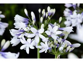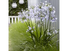 Agapanthus Twister is a showy bi-colored lily-of-the-Nile cultivar. Flowers petals have a dark blue-violet throat that fade to pure white at the tips. The flowers of Twister are reminiscent of Delft pottery, with its blue and white-two toned flowers adding depth and intrigue. Hardy to Zone 7, Twister can be evergreen in mild winters. Twister does best in full sun but can handle part sun/part shade conditions. Growing to 28" tall, this Lily-of-the Nile attracts pollinators such as bees and butterflies. Good for container plantings and cut flowers.