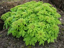 A truly bizarre -looking wood anemone, 'Virescens' is one of the few ornamental flowers that are entirely green. The blooms are an unconventional rosette of finely divided, leaf-like green tepals, often with subtle hues of purple at the tips or center. Like all wood anemones though, Anemone nemorosa 'Virescens' forms a long-lived perennial tuber that leaves out and flowers from March to April, remaining dormant during summer months. Grows to 6" high, preferring shade with filtered light and moist, woodsy soils. Hardy to Zone 4.
