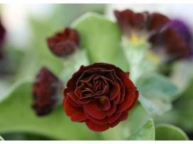 Three gorgeous double flowered cultivars of Primula auricula in varying shades of red: Primula auricula 'Servaz' (dark burgundy), Primula auricula 'William Gunn'(coppery brown), and Primula auricula 'Vesuvius' (deep crimson). All are choice specimens for the alpine house or cool conservatory.