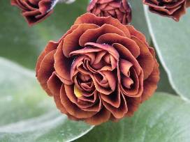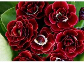 Three gorgeous double flowered cultivars of Primula auricula in varying shades of red: Primula auricula 'Servaz' (dark burgundy), Primula auricula 'William Gunn'(coppery brown), and Primula auricula 'Vesuvius' (deep crimson). All are choice specimens for the alpine house or cool conservatory.