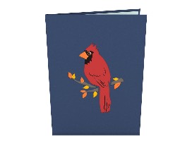 The Cardinal pop-up features a navy blue cover laser-cut with a beautiful red cardinal perched upon a gray branch with orange and yellow leaves.