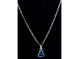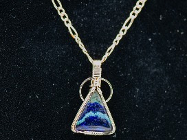 Gold wire triangle pendant with chain. Triangle stone has blue and turquoise tones.
