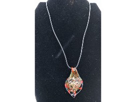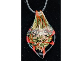 Leather necklace with multi-color glass pendant. Shimmering gold and olive green with red and black accents.