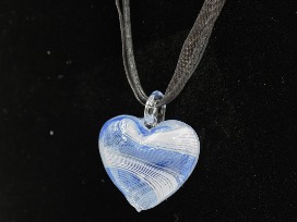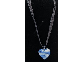 Blue and white glass "Puff" Heart on ribbon necklace.