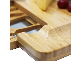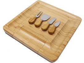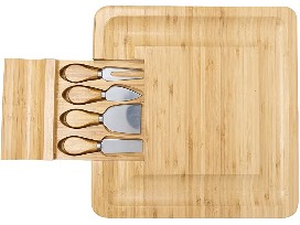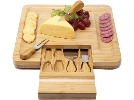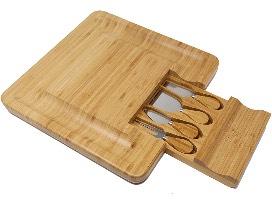 Kagura Bamboo Cheeseboard with slide-out knives drawer. Settle for nothing less than the best with this 100% natural bamboo wood board with large cracker serving border and concealed slide-out storage tray. The tray includes high quality stilton knife, cheddar knife, hard cheese knife, and cheese fork, all with strong stainless steel blades and smooth bamboo handles. Suitable for both cutting and serving, this is the perfect centerpiece for parties and entertaining. Measures 13" x 13".