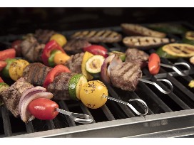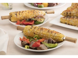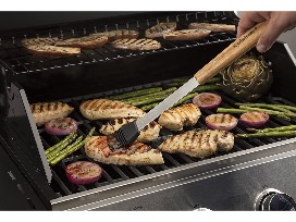 Included are side essential grilling tools such as a spatula, basting brush, cleaning brush, tongs, stainless skewers, and corn cob holders. Long-handled tools have comfortable bamboo wood handles that resist oils and stains.
