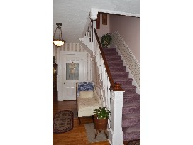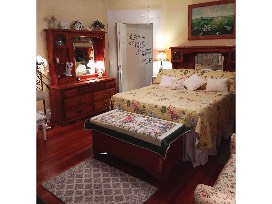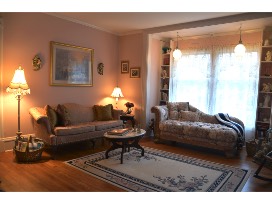Located on the ground floor, The Daisi Room includes a queen-size bed and a comfortable chair that opens to a twin-size bed, with a full private bathroom with makeup vanity. Looking out on the front veranda, this room is refreshingly springtime in its decor.