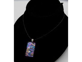 Handmade blue and pink dichroic glass pendant with dragonflies and sterling silver bezel.